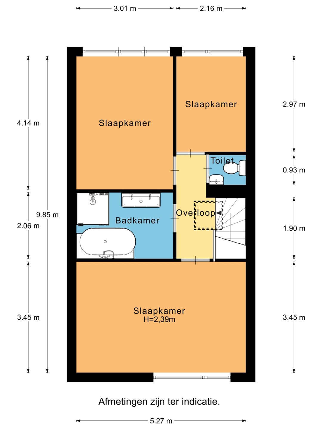 Op de tweede verdieping bevinden zich drie slaapkamers en de badkamer. Een grote slaapkamer aan de voorzijde. De badkamer ligt centraal en is voorzien van een ligbad, douchecabine en wastafel. Aan de achterzijde bevindt zich een tweede, comfortabele slaapkamer en nog een slaapkamer. Beide slaapkamers hebben ook elektrisch bedienbare zonneschermen.