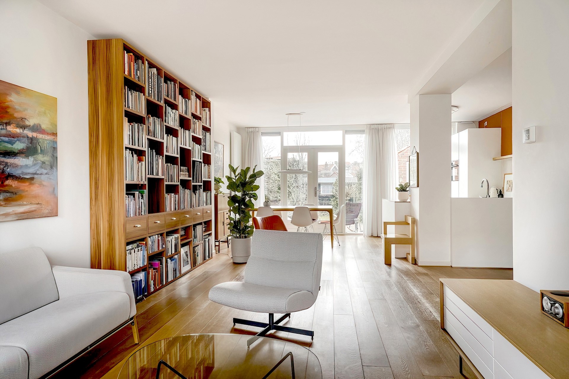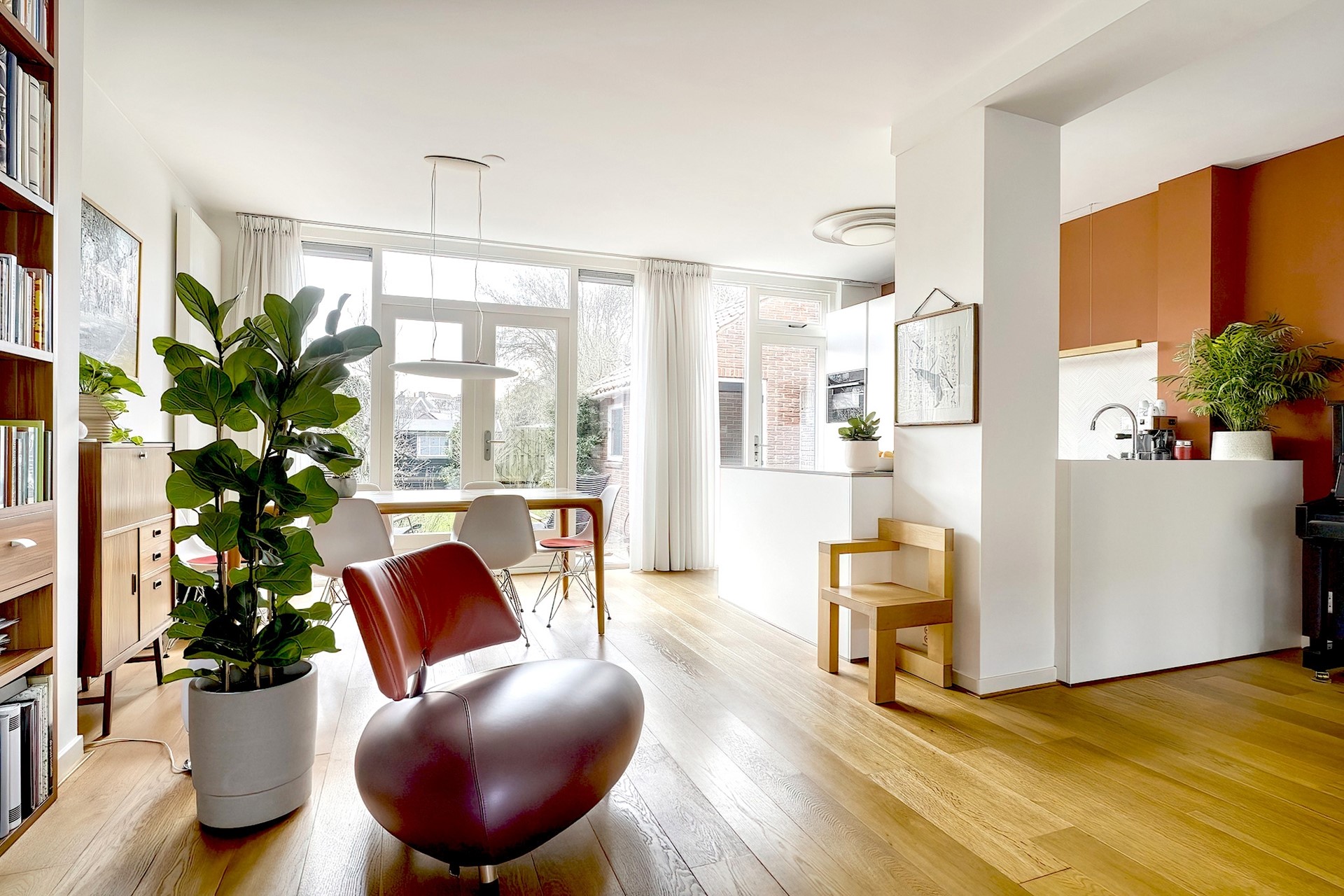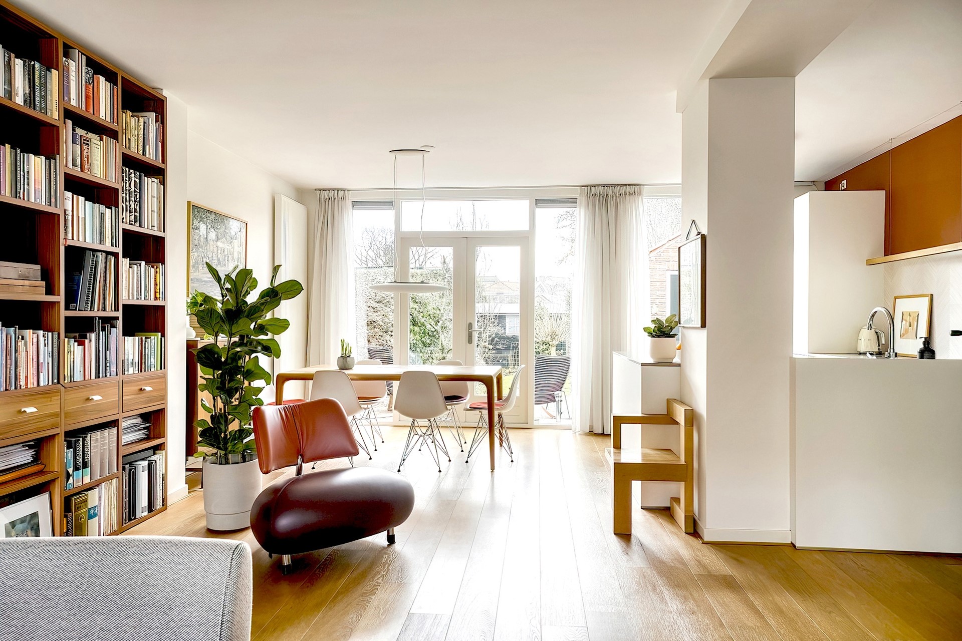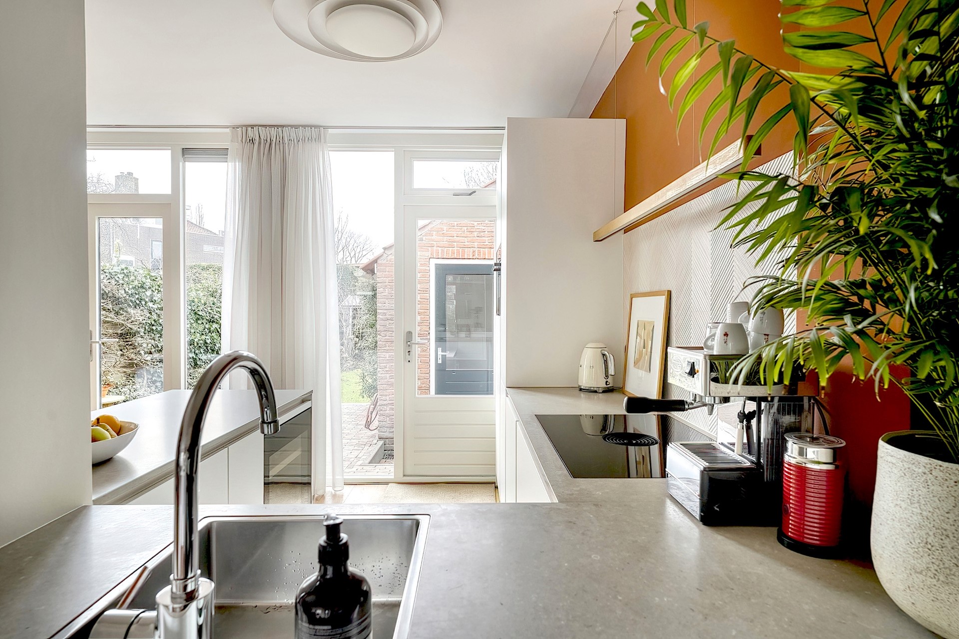 De uitgebouwde begane grond biedt een royale leefruimte met volop daglicht en een moderne open keuken (2024) die van alle gemakken is voorzien, te weten een Bora-inductie kookplaat, vaatwasser, koelkast, combi-oven en zelfs een wijnklimaatkast. De keuken biedt naar alle kanten contact met de woonkamer. Dankzij de uitbouw is er een fijne, open sfeer ontstaan die perfect is voor zowel het dagelijkse gezinsleven als gezellige avonden met vrienden. Vanuit de woonkamer zijn er dubbele openslaande deuren en een aparte loopdeur naar de achtertuin.
