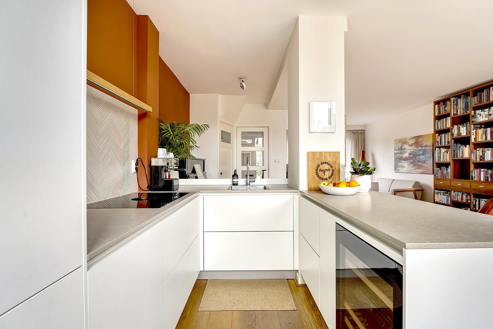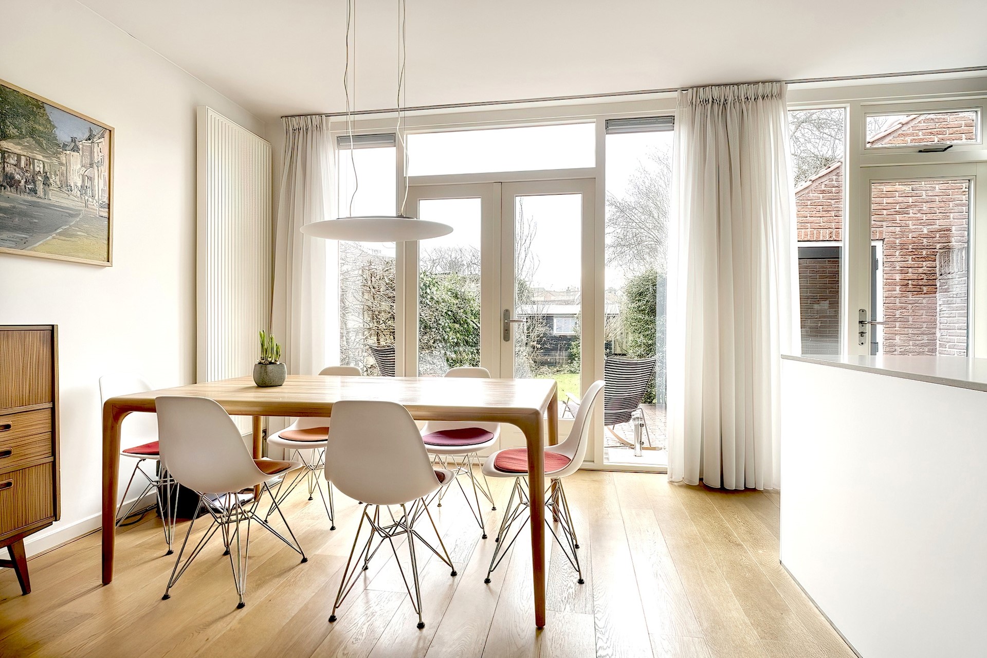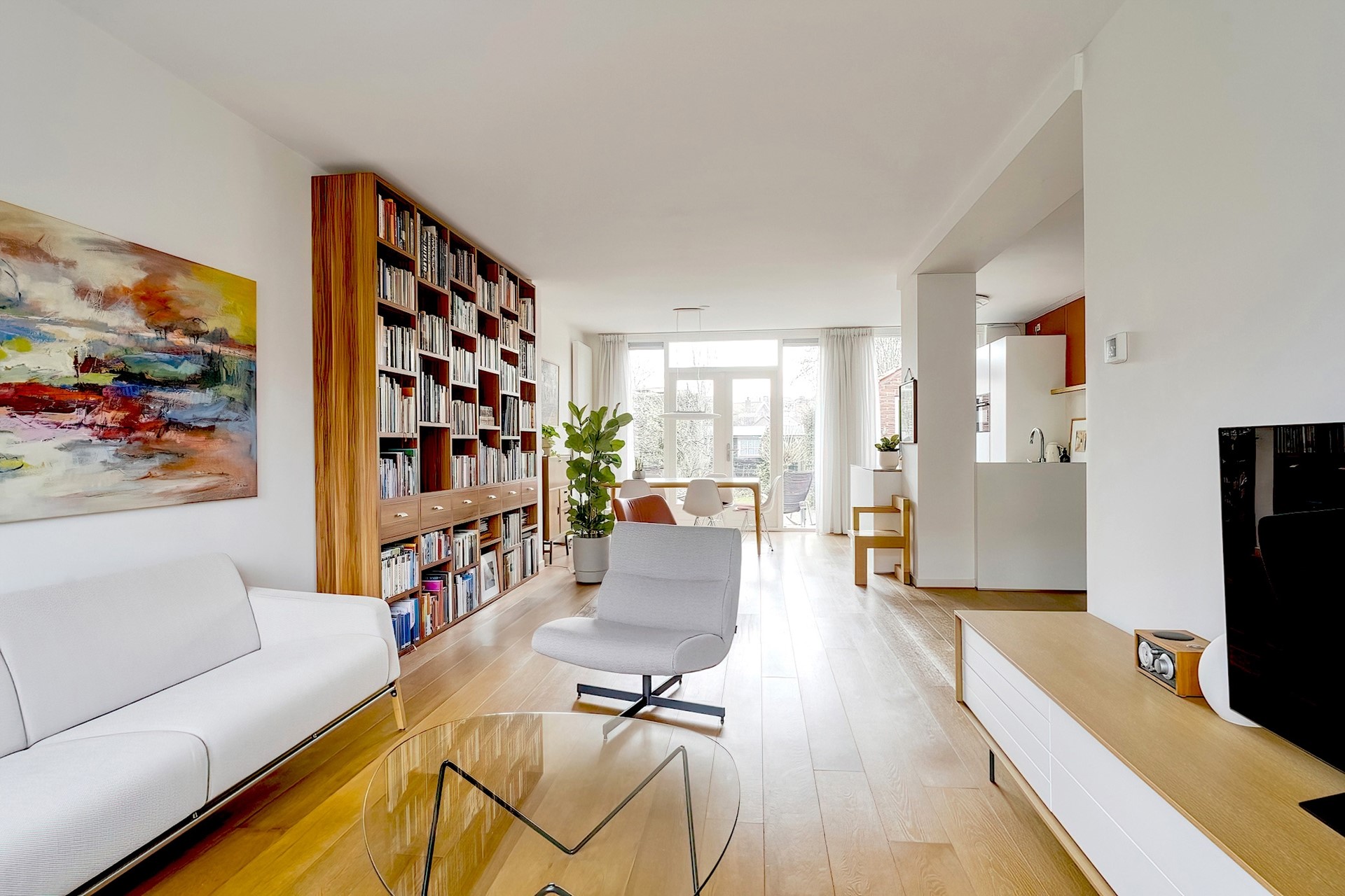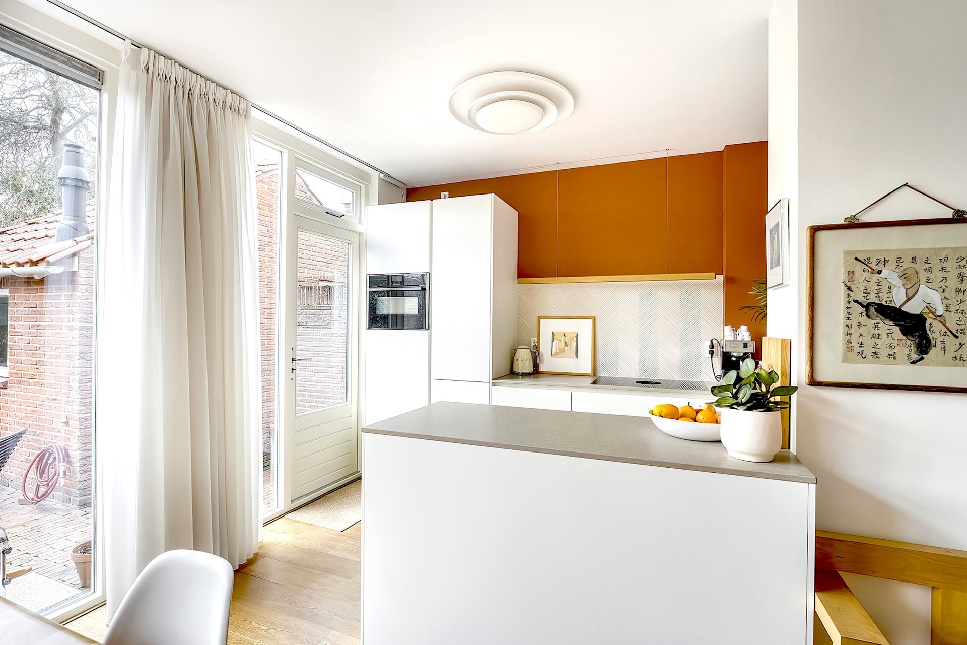 De uitgebouwde begane grond biedt een royale leefruimte met volop daglicht en een moderne open keuken (2024) die van alle gemakken is voorzien, te weten een Bora-inductie kookplaat, vaatwasser, koelkast, combi-oven en zelfs een wijnklimaatkast. De keuken biedt naar alle kanten contact met de woonkamer. Dankzij de uitbouw is er een fijne, open sfeer ontstaan die perfect is voor zowel het dagelijkse gezinsleven als gezellige avonden met vrienden. Vanuit de woonkamer zijn er dubbele openslaande deuren en een aparte loopdeur naar de achtertuin.