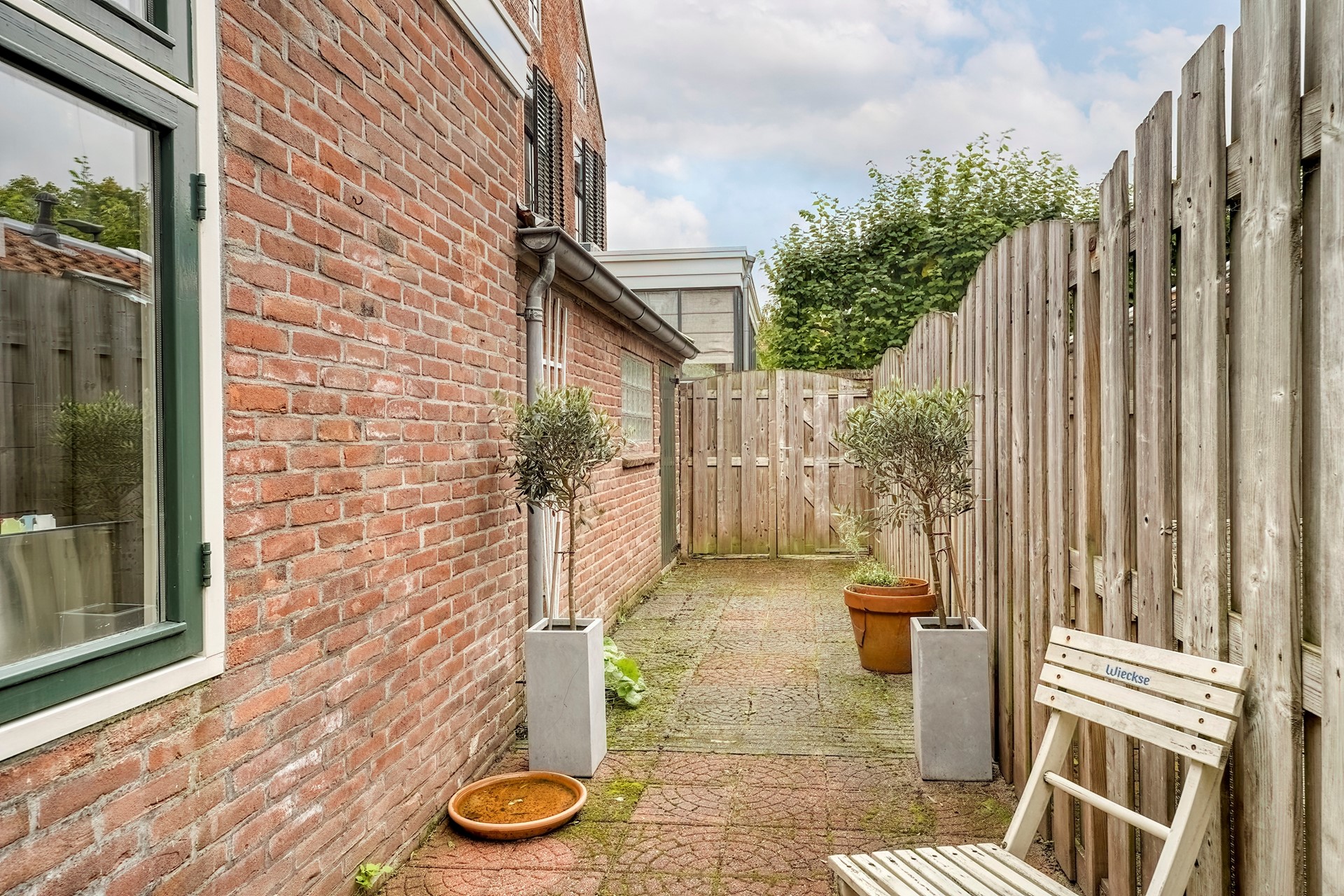De woning heeft aan de voorzijde een grotendeels betegelde tuin op het Zuidwesten, met een aangebouwde schuur waar de cv-ketel hangt. De tuin biedt volop privacy en biedt een goede basis om een sfeervolle buitenruimte te realiseren. Via het grote raam van de woonkamer kan je ook naar de tuin aan de oostzijde, die op de Baan uitkomt.