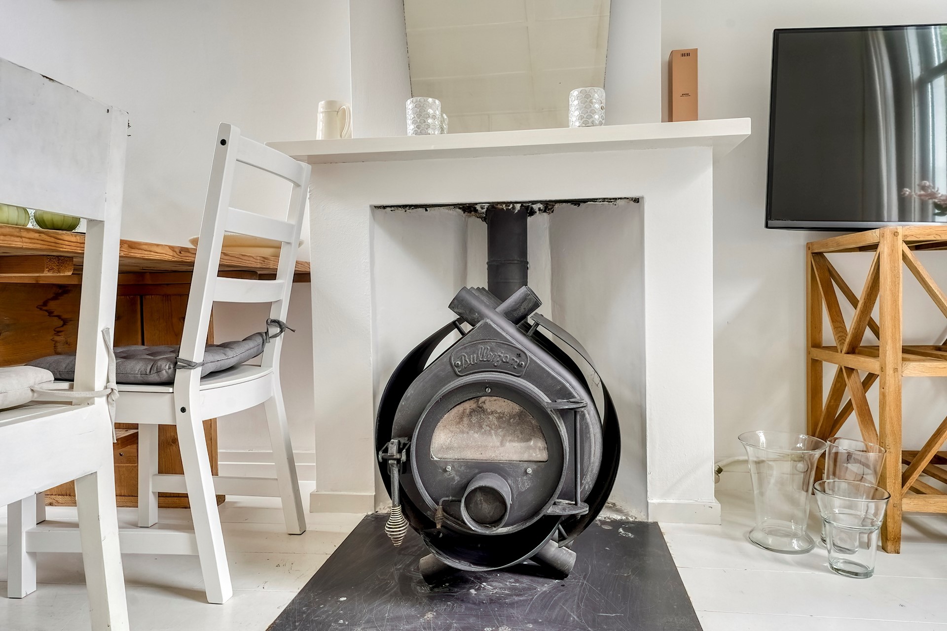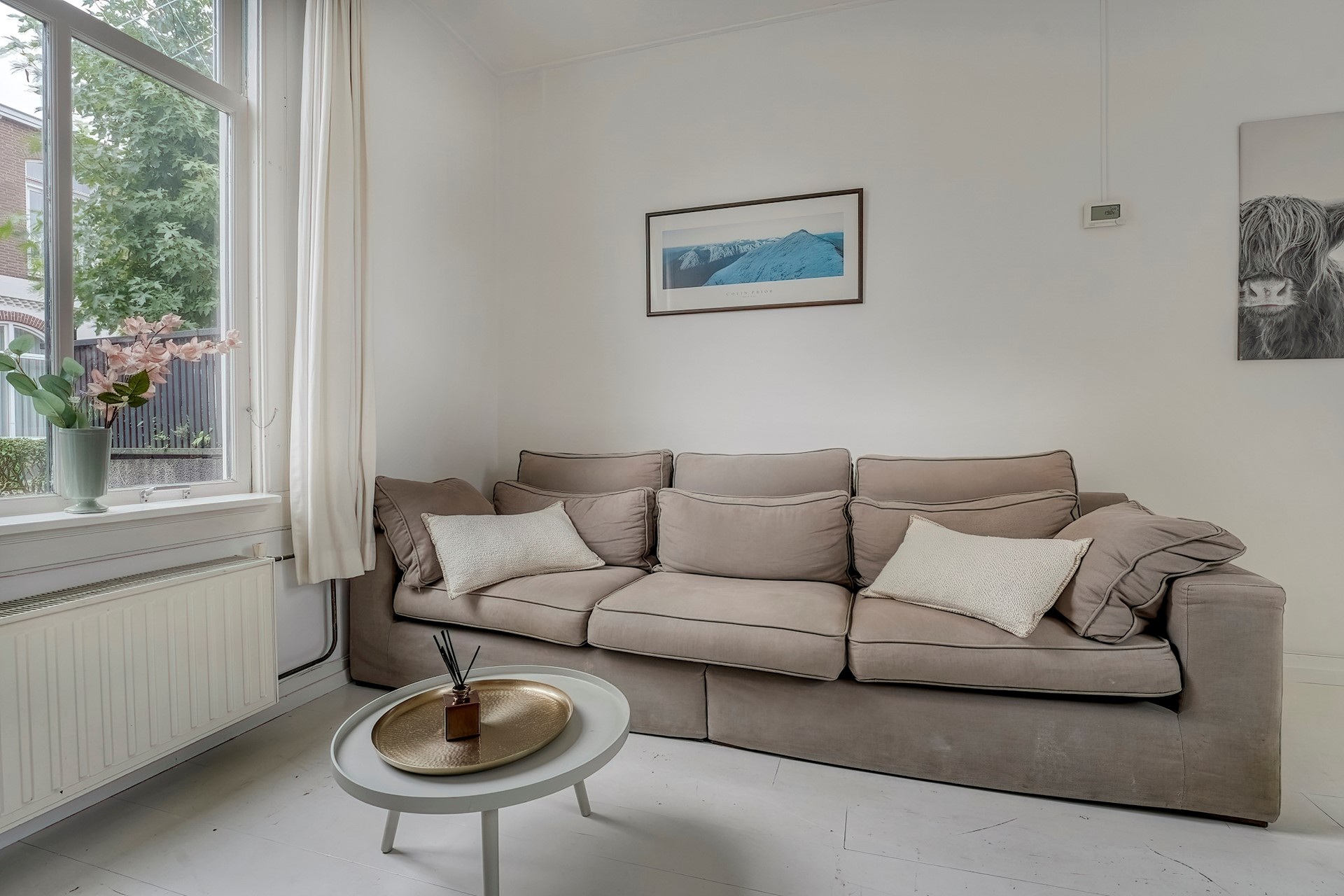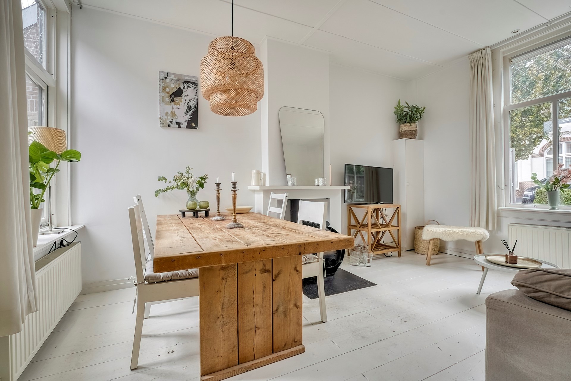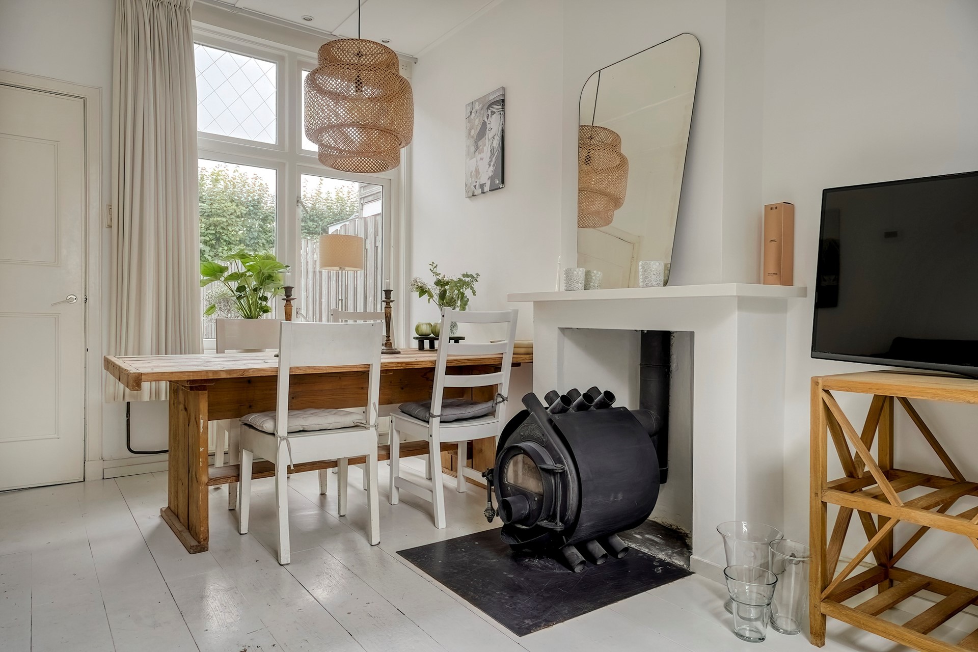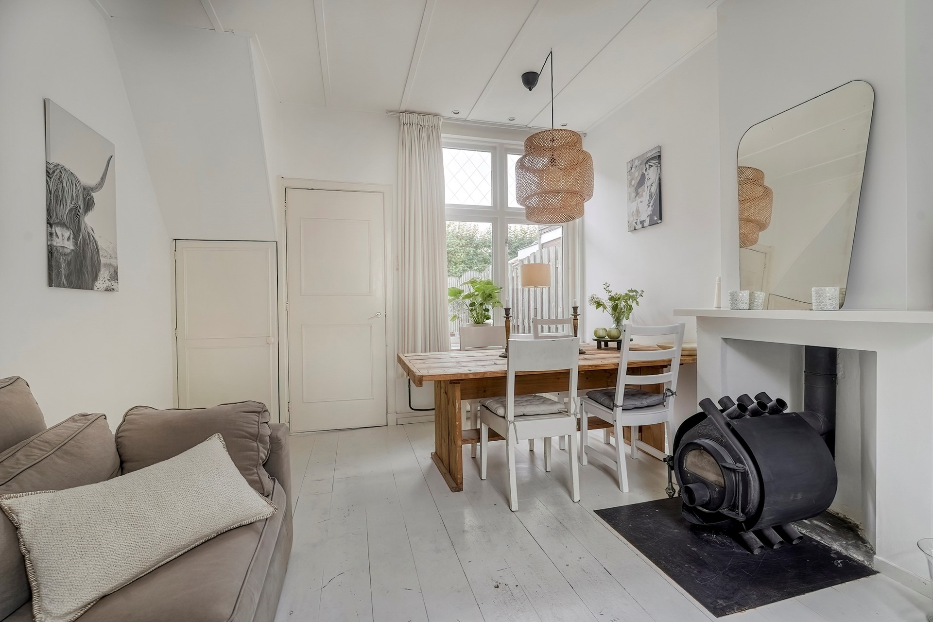 Aan de straatkant door het hek kom je in de tuin. Daar is ook de voordeur. Via de hal kom je links in de woonkamer, die aan 2 kanten grote ramen heeft en daardoor heel erg licht is. De woonkamer heeft een schouw waar een mooie kachel kan staan. De ouderwets hoge plafonds geven een heel prettige en rustige sfeer aan deze ruimte.