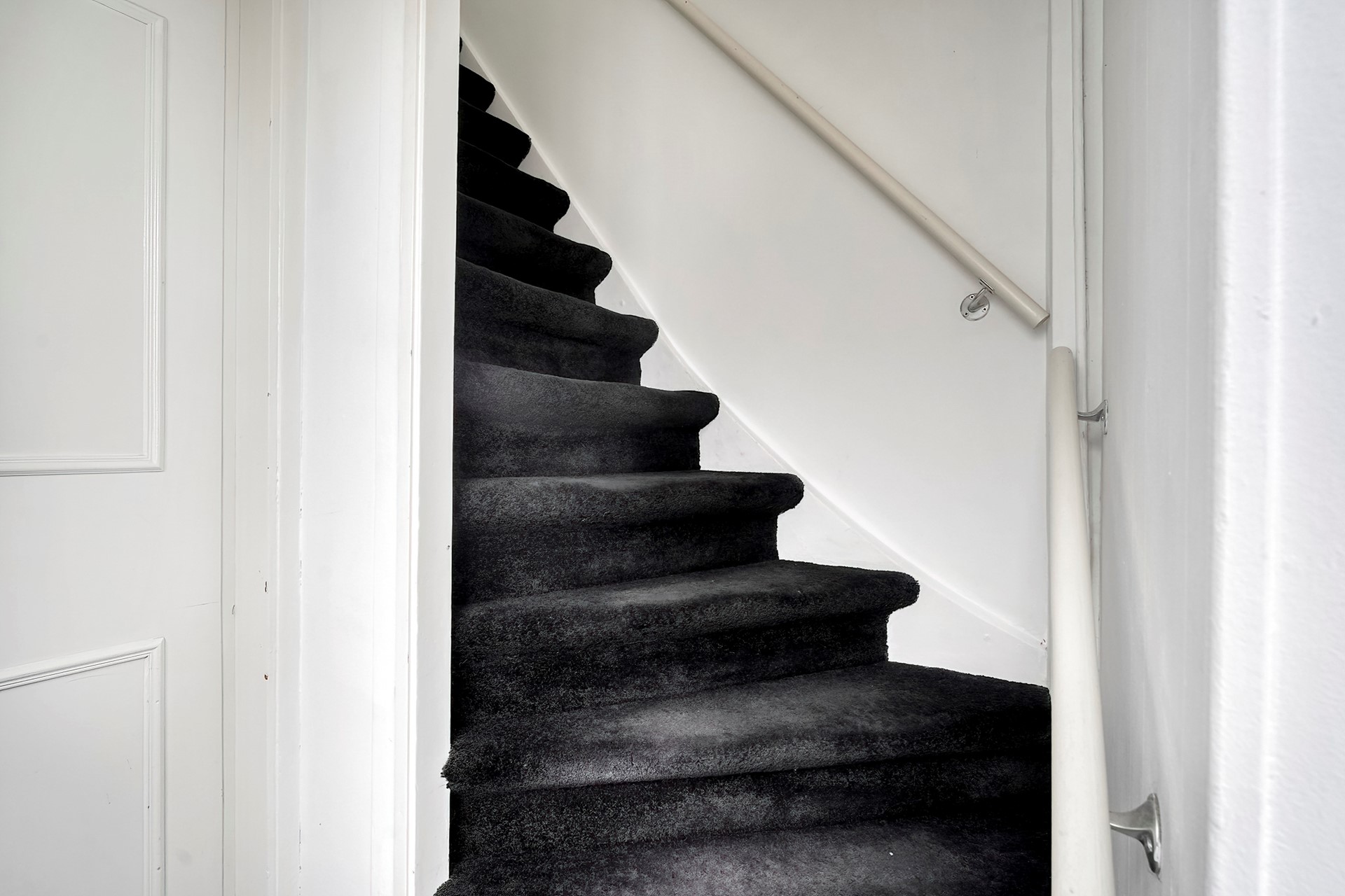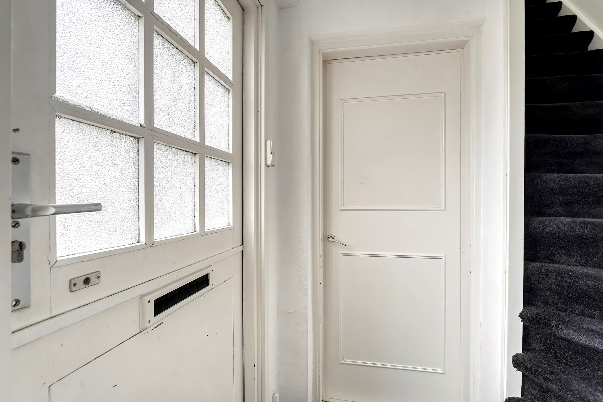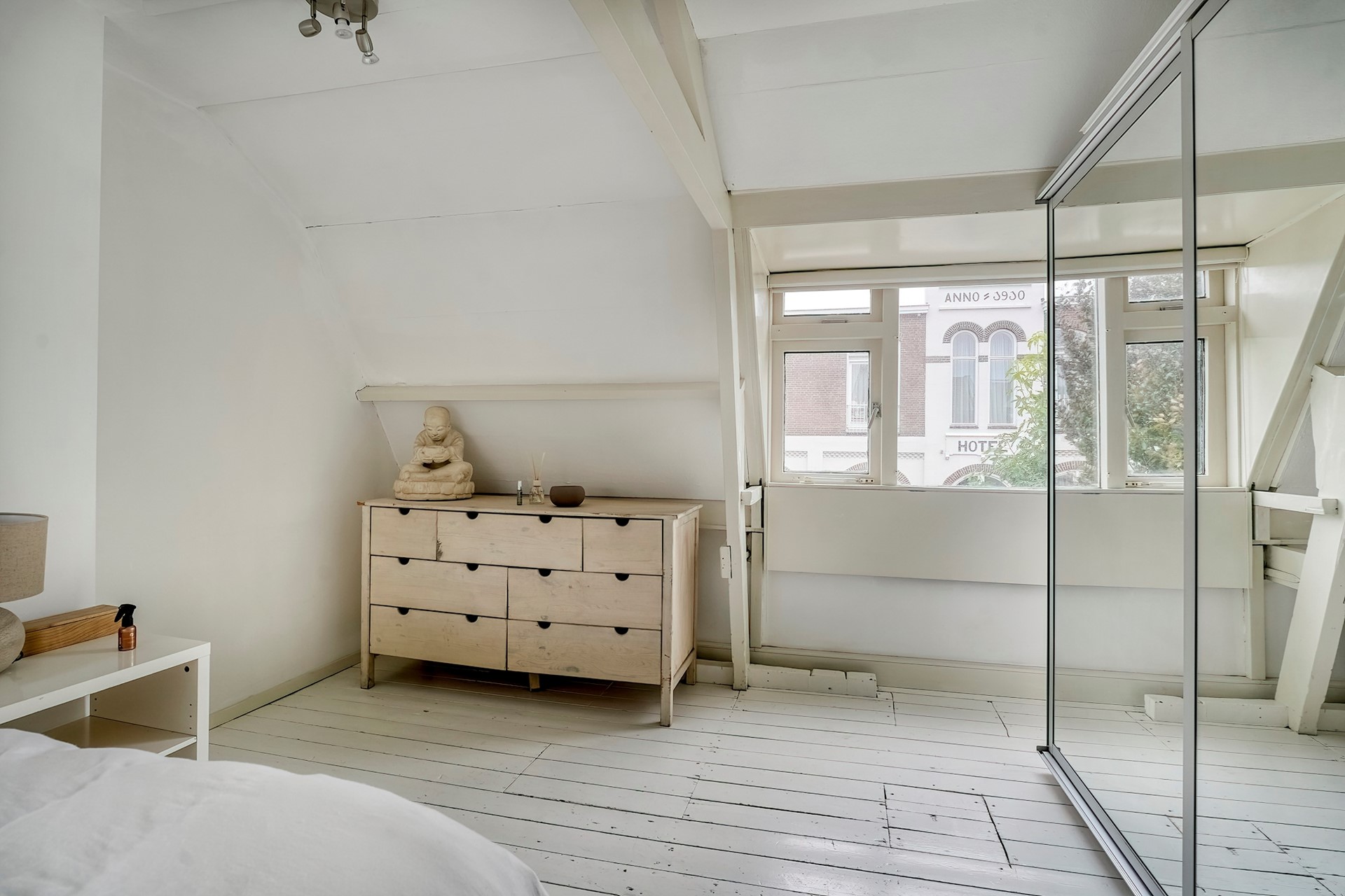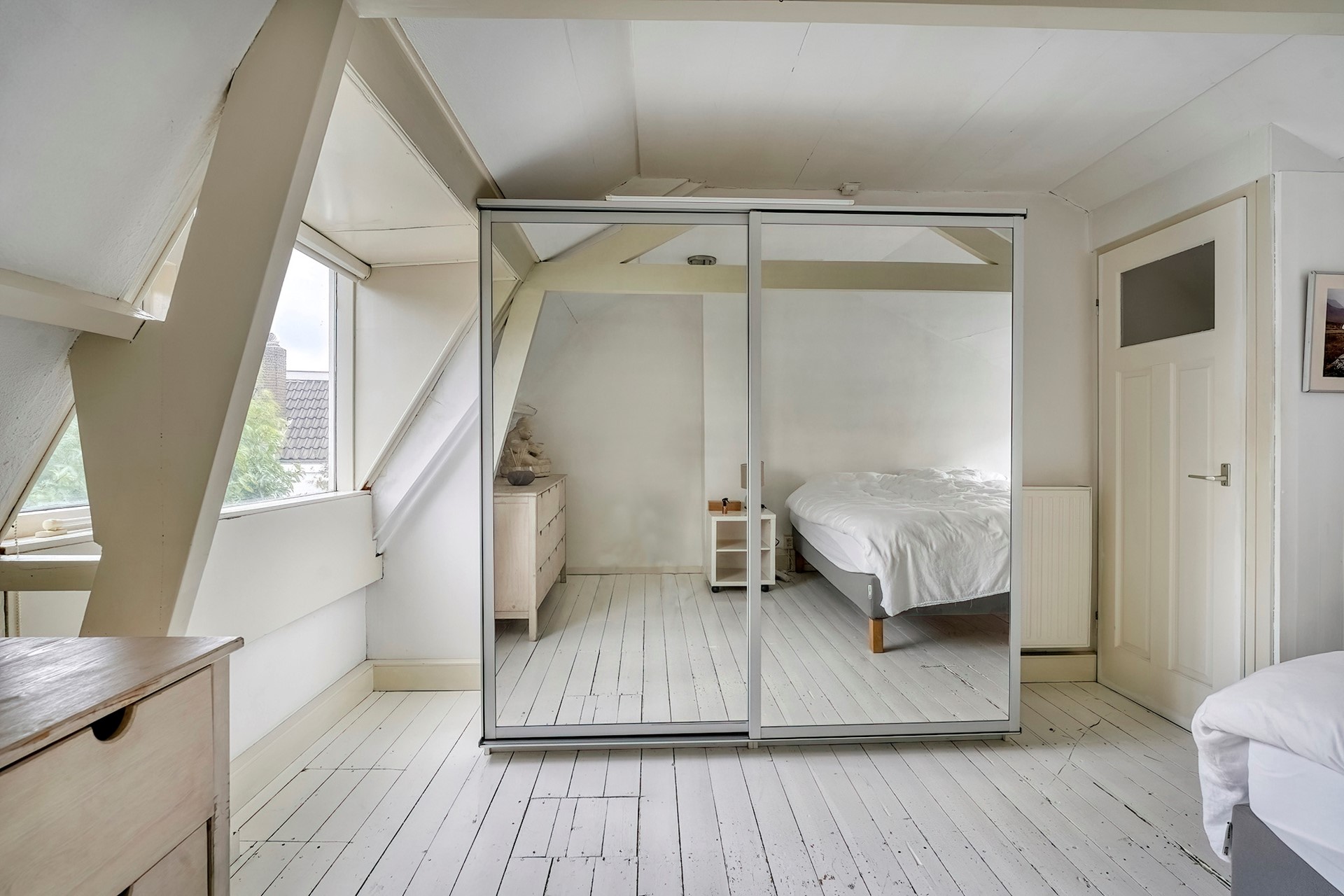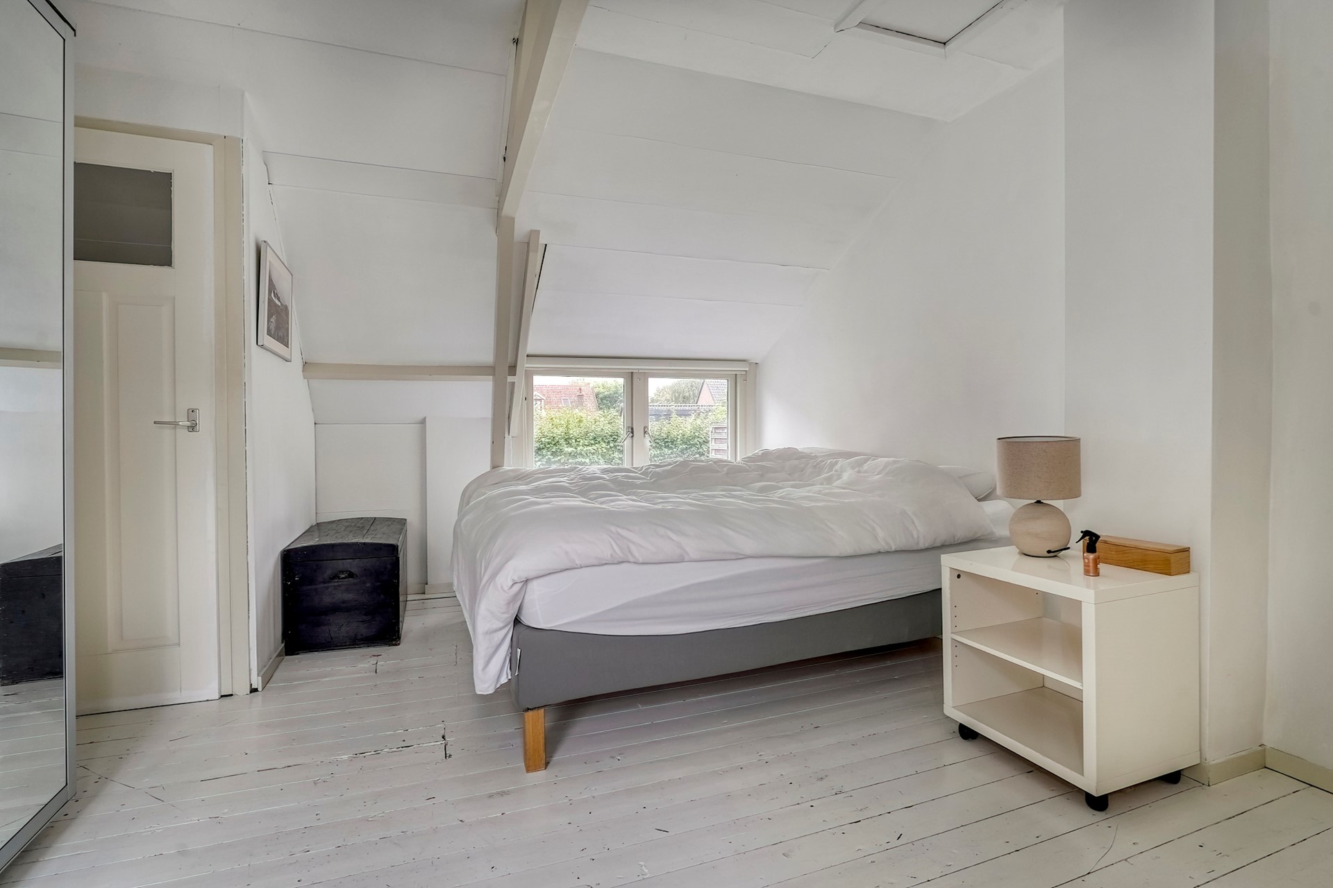 De trap naar boven vanuit de gang is stevig en heeft nog een kleine verborgen bergplaats onder het schuine dak voor spullen die je iets minder vaak gebruikt. Eenmaal boven dan kan je niet anders dan je heel prettig voelen in deze zeer ruime slaapkamer. Ooit waren dit 2 kamers, maar de indeling op deze manier voelt veel fijner aan.