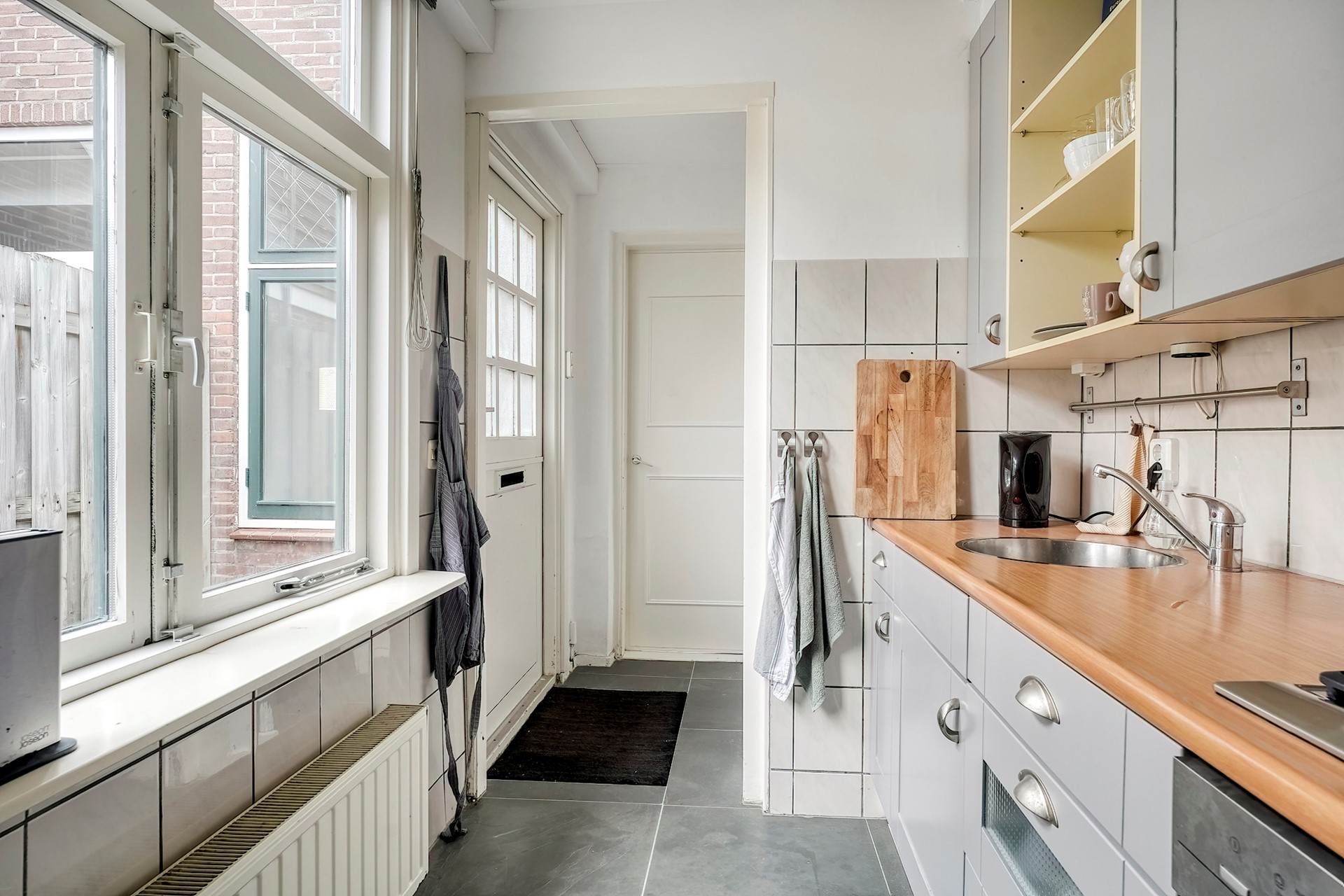 Aan de andere kant van de hal is de keuken. Deze is nog heel keurig en vooral de vele kastruimte maakt dat je hier prettig kan koken. Ook de keuken heeft een groot raam naar de tuin. Via de keuken kom je in de achtergelegen badkamer, die eenvoudig is ingericht met een douche, wastafel en toilet. Onder de wastafel is voldoende ruimte om een wasmachine en een wasdroger neer te zetten.